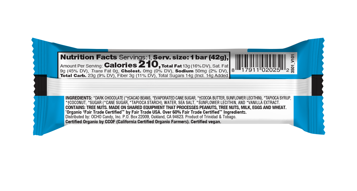 Organic Dark Chocolate (Organic & Fair Trade Cacao Beans, Organic Evaporated Cane Sugar, Organic & Fair Trade Cocoa Butter, Sunflower Lecithin), Organic Tapioca Syrup, Organic & Fair Trade Coconut, Organic Sugar (Organic Cane Sugar, Organic Tapioca Starch), Water, Sea Salt, Organic Sunflower Lecithin, Organic Vanilla Extract. *CONTAINS TREE NUTS*