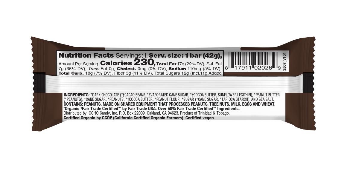 Organic Dark Chocolate (Organic & Fair Trade Cacao Beans, Organic Evaporated Cane Sugar, Organic & Fair Trade Cocoa Butter, Sunflower Lecithin), Organic Peanut Butter (Organic Peanuts), Organic Cane Sugar, Organic & Fair Trade Cocoa Butter, Organic Peanut Flour, Organic Sugar (Organic Cane Sugar, Organic Tapioca Starch), Sea Salt. *CONTAINS PEANUTS*