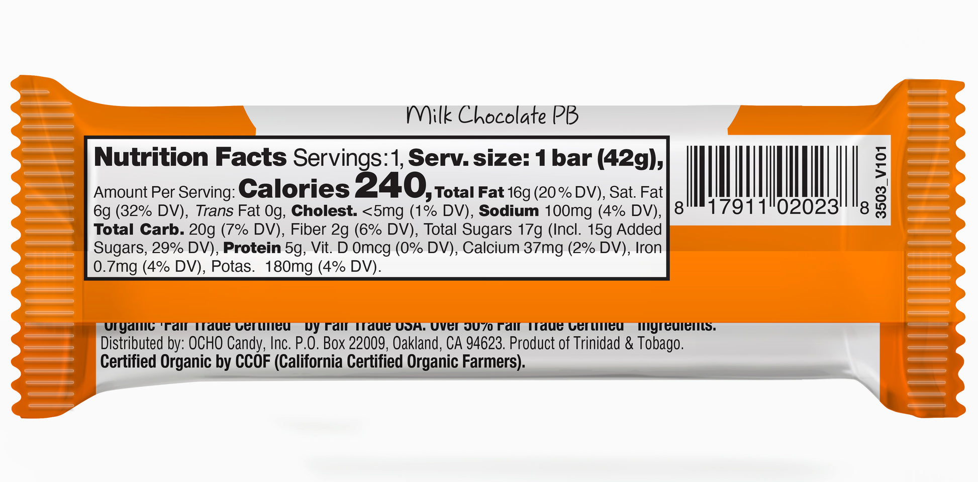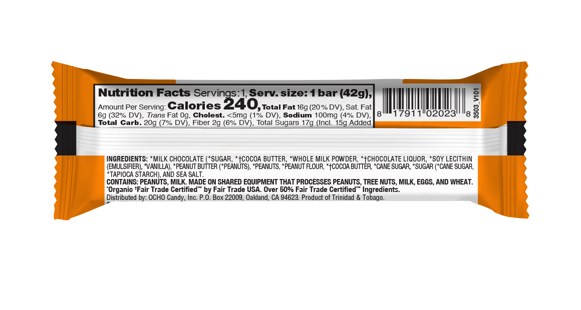 Organic Milk Chocolate (Organic Sugar, Organic & Fair Trade Cocoa Butter, Organic Whole Milk Powder, Organic & Fair Trade Cacao Beans, Organic Soy Lecithin, Organic Vanilla), Organic Peanut Butter (Organic Peanuts), Organic Peanut Flour, Organic & Fair Trade Cocoa Butter, Organic Cane Sugar, Organic Sugar (Organic Cane Sugar, Organic Tapioca Starch) Sea Salt. *CONTAINS PEANUTS, MILK*